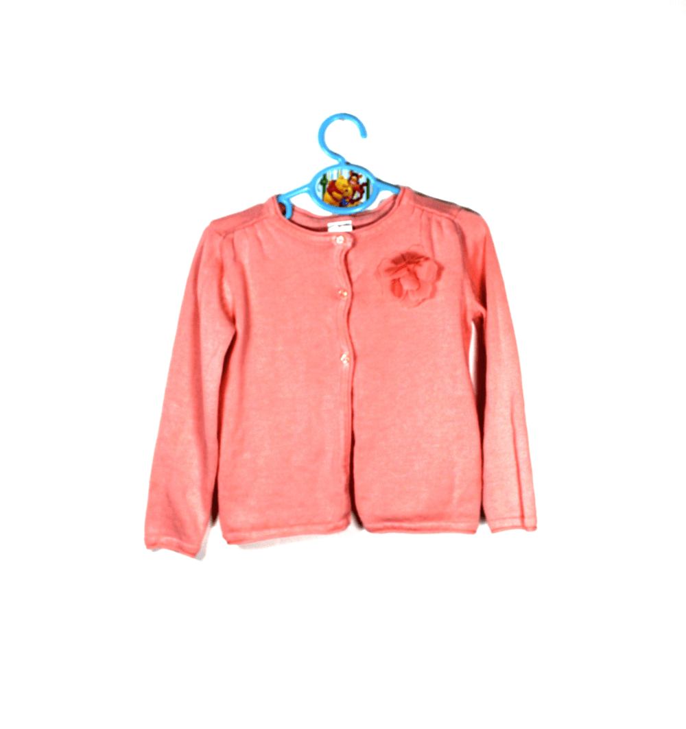 Raglan mouwtjes en een grote zalmkleurige bloem.