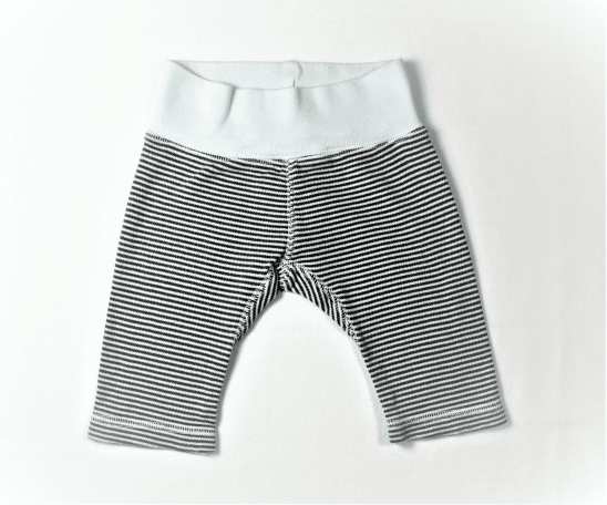 Aanvullende informatie: een grijs en wit gestreept broekje met breed wit tailleband.
