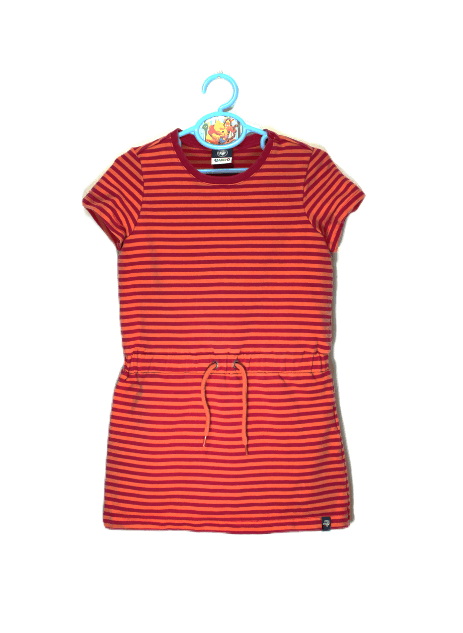 Dit jurkje heeft een ronde hals met klein rood boordje