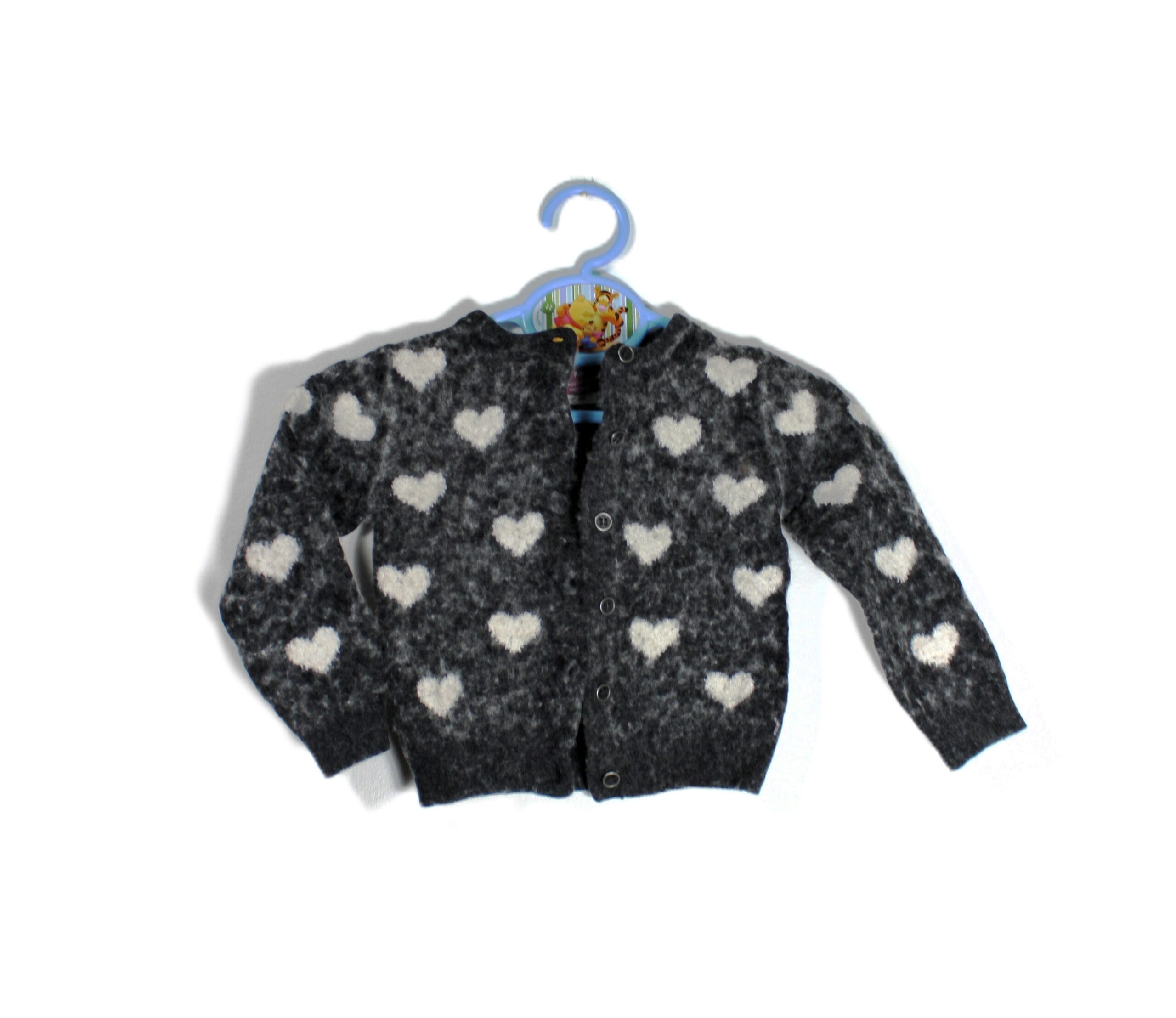 Dit vestje heeft een all over patroon van witte hartjes en lange mouwen.