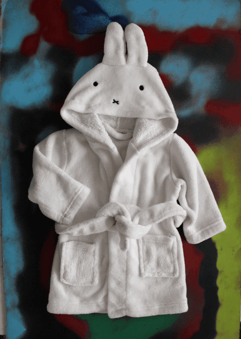 De capuchon heeft het gezichtje van Nijntje en 2 lange oortjes.