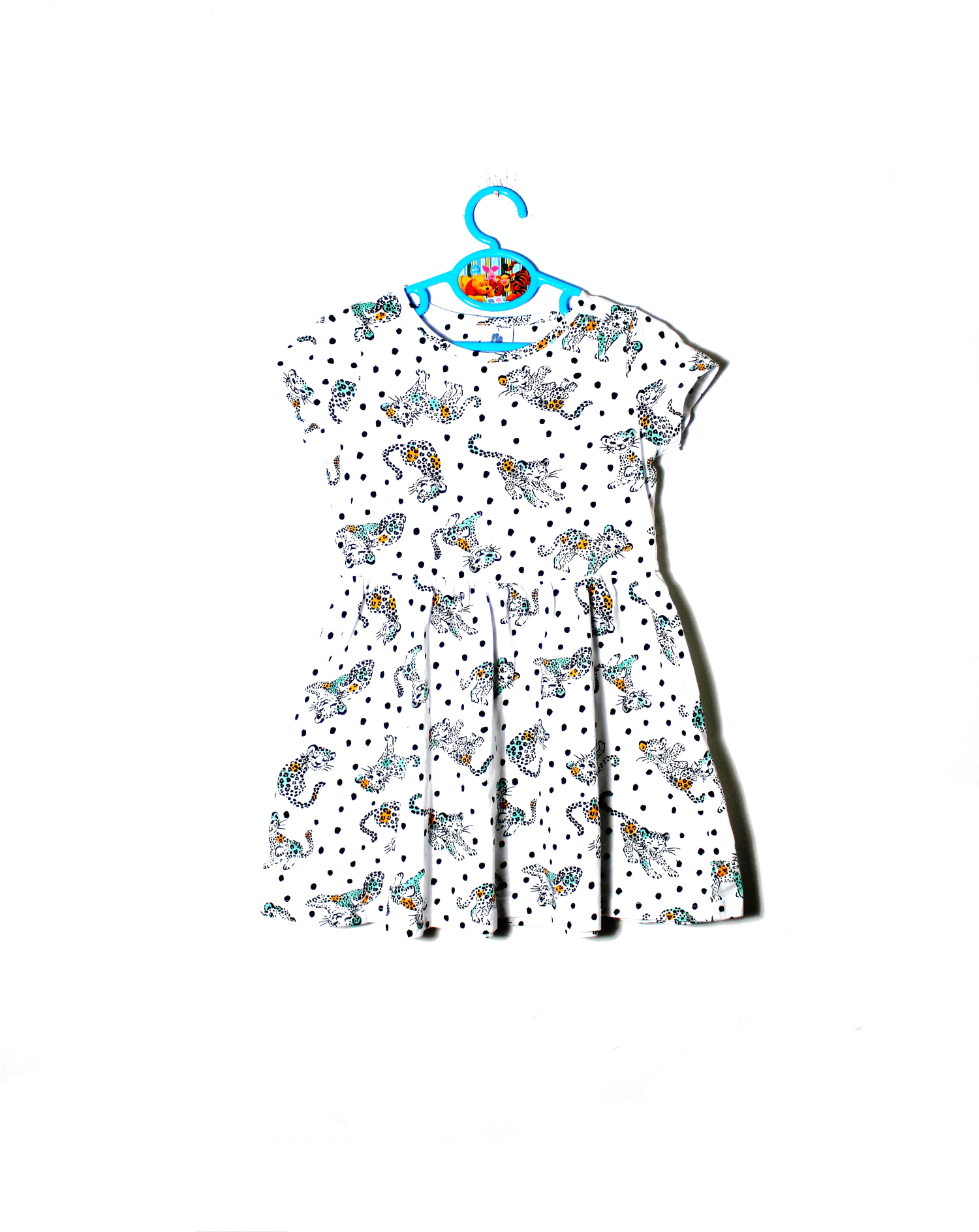 Aanvullende informatie: een super mooi wit jurkje met een all over print van verschillende katjes en zwarte stippen.
