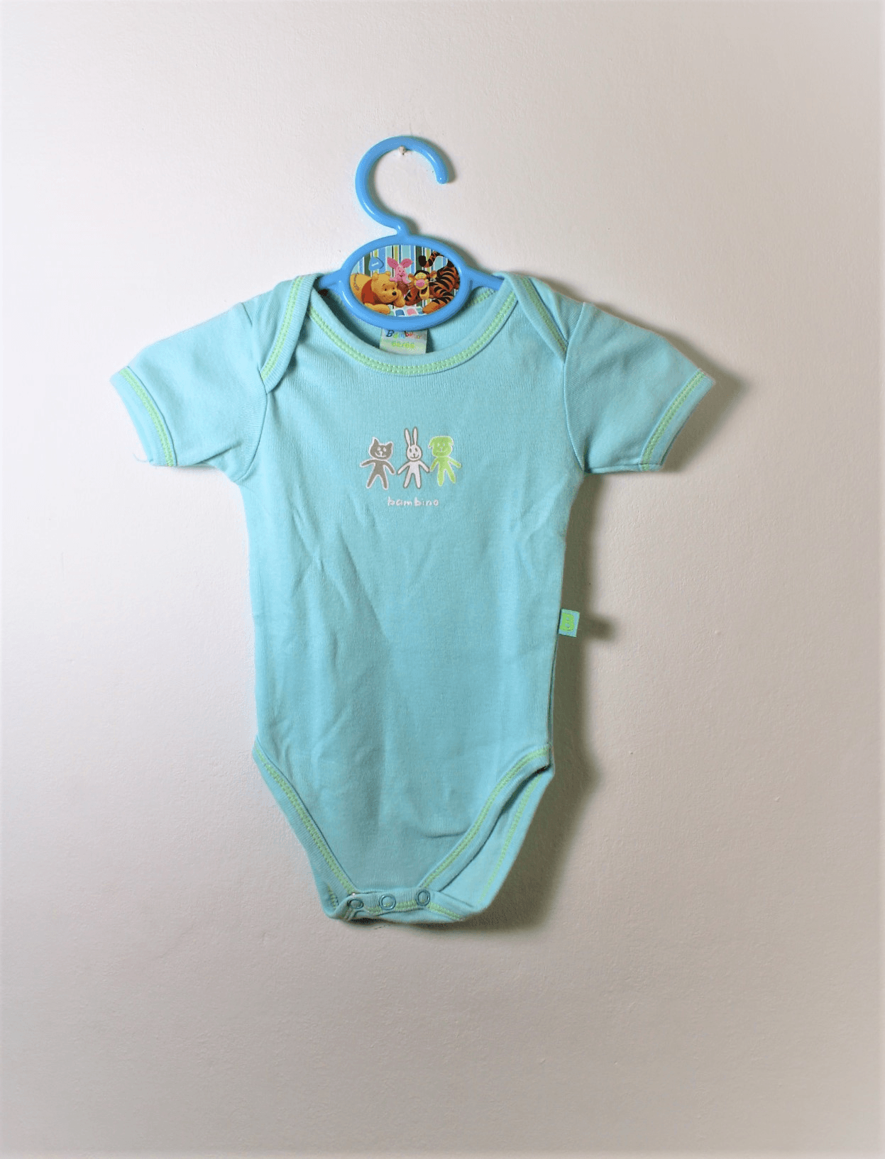 Aanvullende informatie: een mooi stretch mintgroen rompertje met korte mouwtjes.
