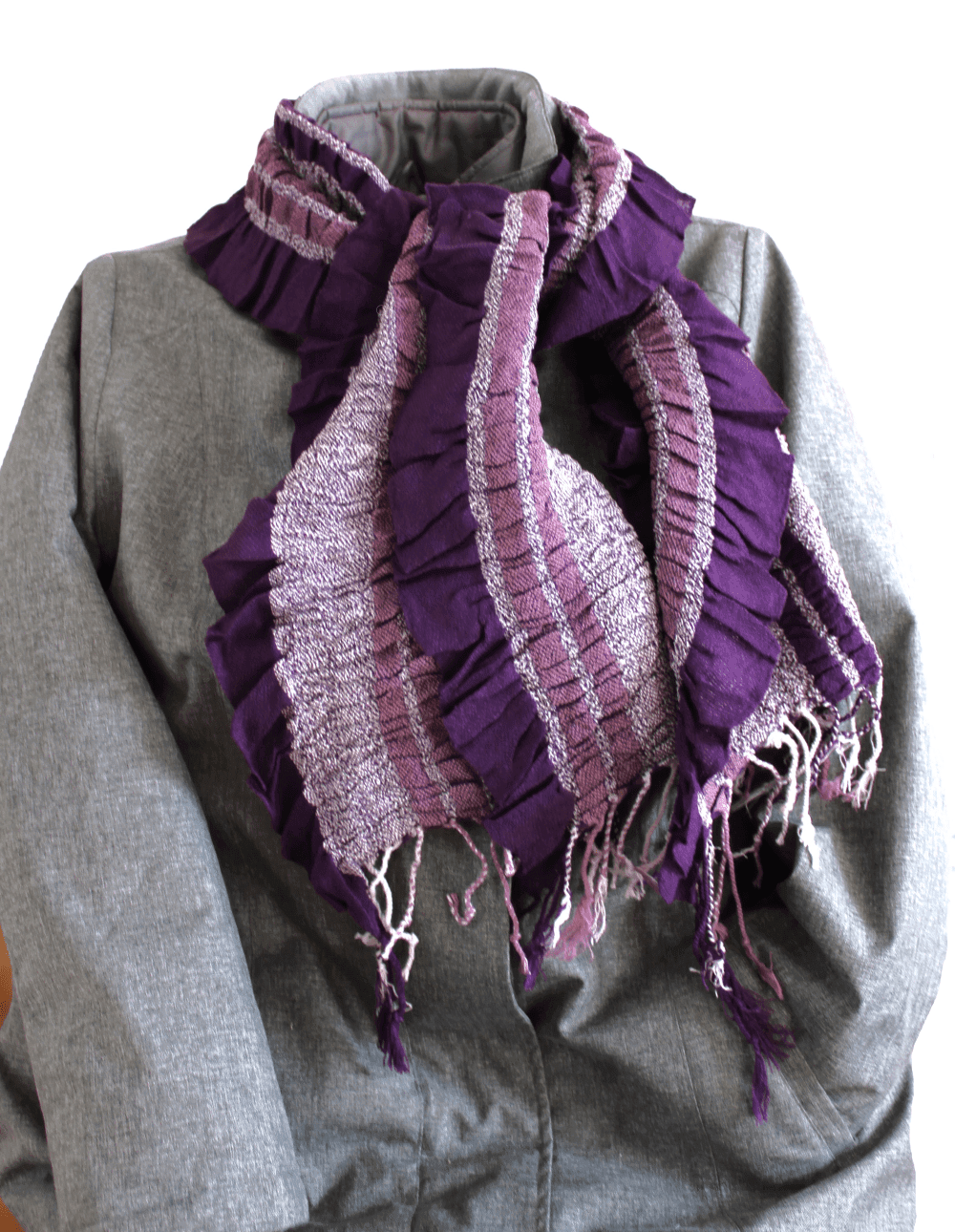 Aanvullende informatie:  een super mooi en aparte dunne sjaal met paarse ruches en gekleurde franjes.