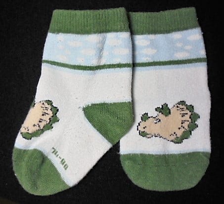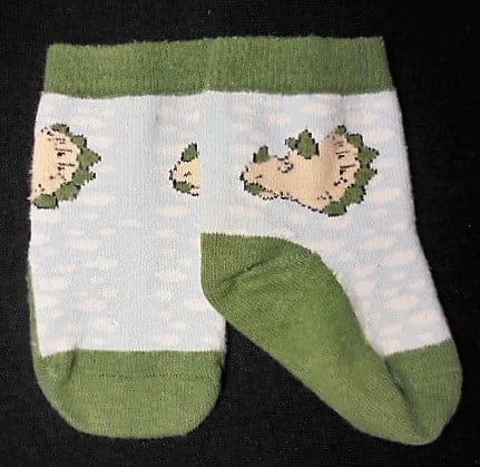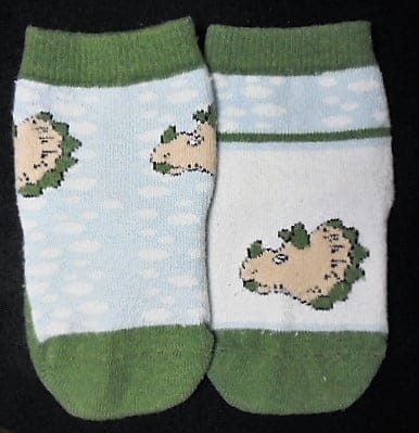 Het andere heeft blauw met wit “wolkjes” met 2 dino’s erop bij de enkel.